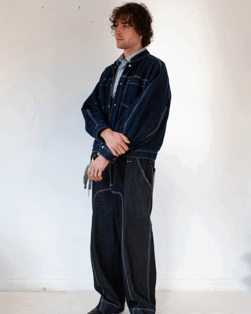Doubling as a solo contractor and working for Sylvester by day, he spends the rest of his time crafting made-to-order pieces and collections, from digital pattern concept to flat lay construction. Each design begins with a feeling or idea, often inspired by the people around him, and shaped while walking around Tāmaki Makaurau. “I’m really interested in seeing how people are and the way their clothes behave, and breaking that down.” Fringes features a mastery of pattern and material layering, with colourways of greys, blacks, and blues, inspired by Mora-Hill’s colour blindness — he sees blue the strongest, thus works in monochrome. He describes the ethos of Fringes: “[There’s] a huge importance on the fact that people really wear these clothes, making that wear visible, and creating a true feeling of ownership.”
