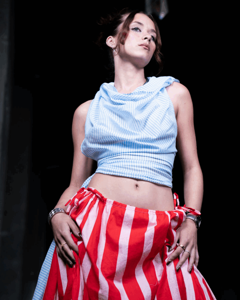 Fast forwarding to Āhua this year, Giles found herself working alongside Fringes designer Finn Mora-Hill. The process was intuitive and deeply collaborative. “There was so much mutual respect — we just got each other creatively.” While Mora-Hill led the collection, ‘In Over Our Heads’, she responded instinctively, crafting pieces to complement his ideas. “There was no rigid plan. It came from hanging out, chatting, making, and just seeing what stuck.”
