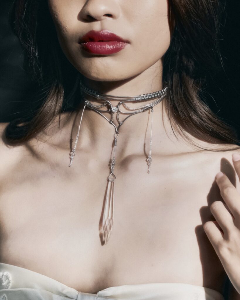 Originally trained in visual arts, jewellery wasn’t initially the plan. “I thought I’d go the traditional route, and be making work for galleries,” she laughs. But when she began making insects from wire in a sculpture class, everything clicked. The wire became pendants. Pendants became headpieces. And, all together, it became a practice. Now, Anthurium is a space for experimentation and transformation — visually, spiritually, and emotionally. “I see jewellery as a form of protection. It’s healing, and an elevation of myself,” she says.
