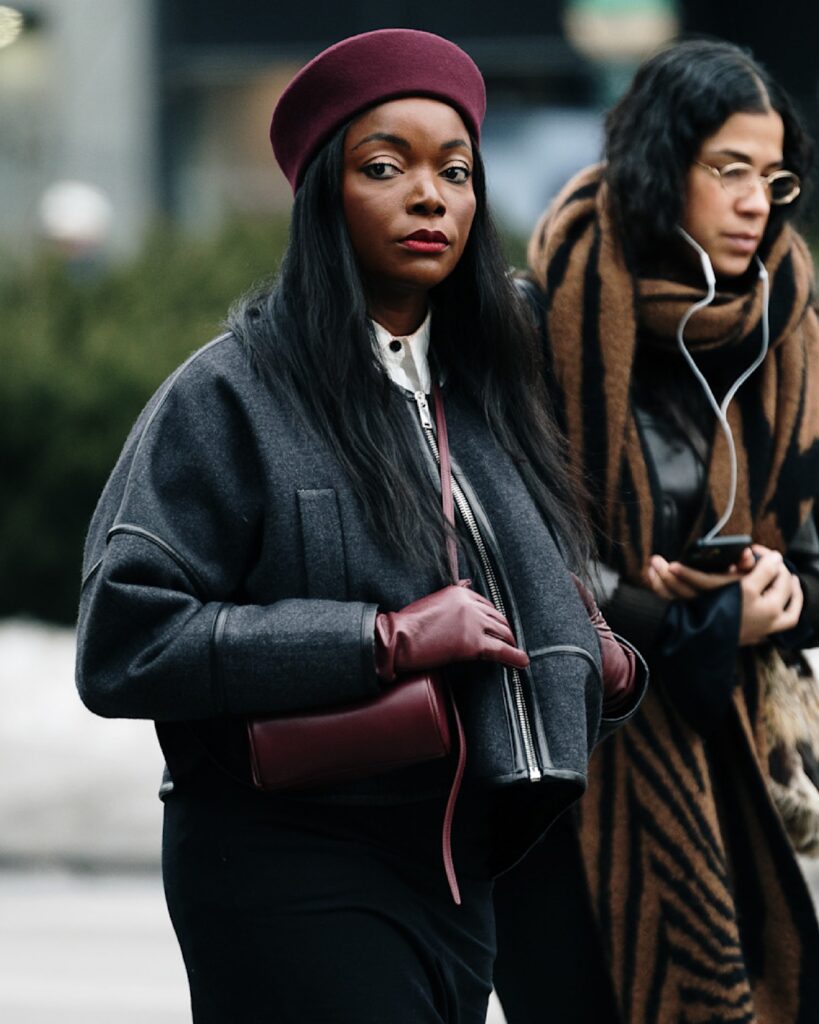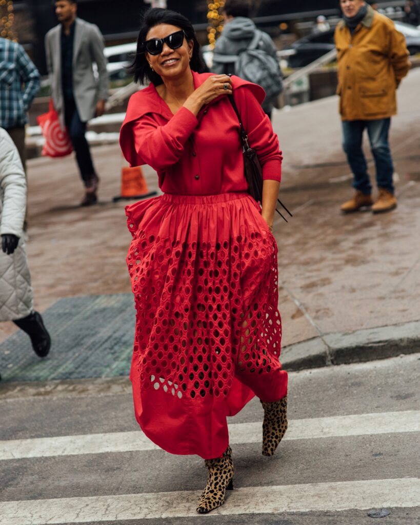 Not quite ready to dive headfirst into a colour-soaked wardrobe? Add a point of interest to an otherwise neutral outfit with a pop of red. We spotted scarlet knits peeking out from under winter coats, crimson satin skirts contrasting black leather and plenty of striking red accessories.