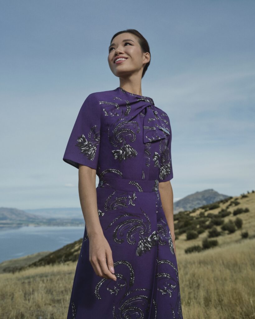 The collection is a testament to Emilia Wickstead’s refined craftsmanship – showcased in The Fine Print dress, a hero piece featuring an intricate tūī knot neckline, inspired by both the tuft of the beloved native bird, and also the neckline of the first Air New Zealand uniform designed by Yves Saint Laurent for Christian Dior. But beyond its elegance, the uniform also signals a meaningful step towards inclusivity. The uniform features a modern take on the traditional Ie Faitaga, that will be trialled by Pasifika team members, while The Collective Thread shirt offers a versatile, gender-inclusive option designed to be worn by all crew and ground staff.