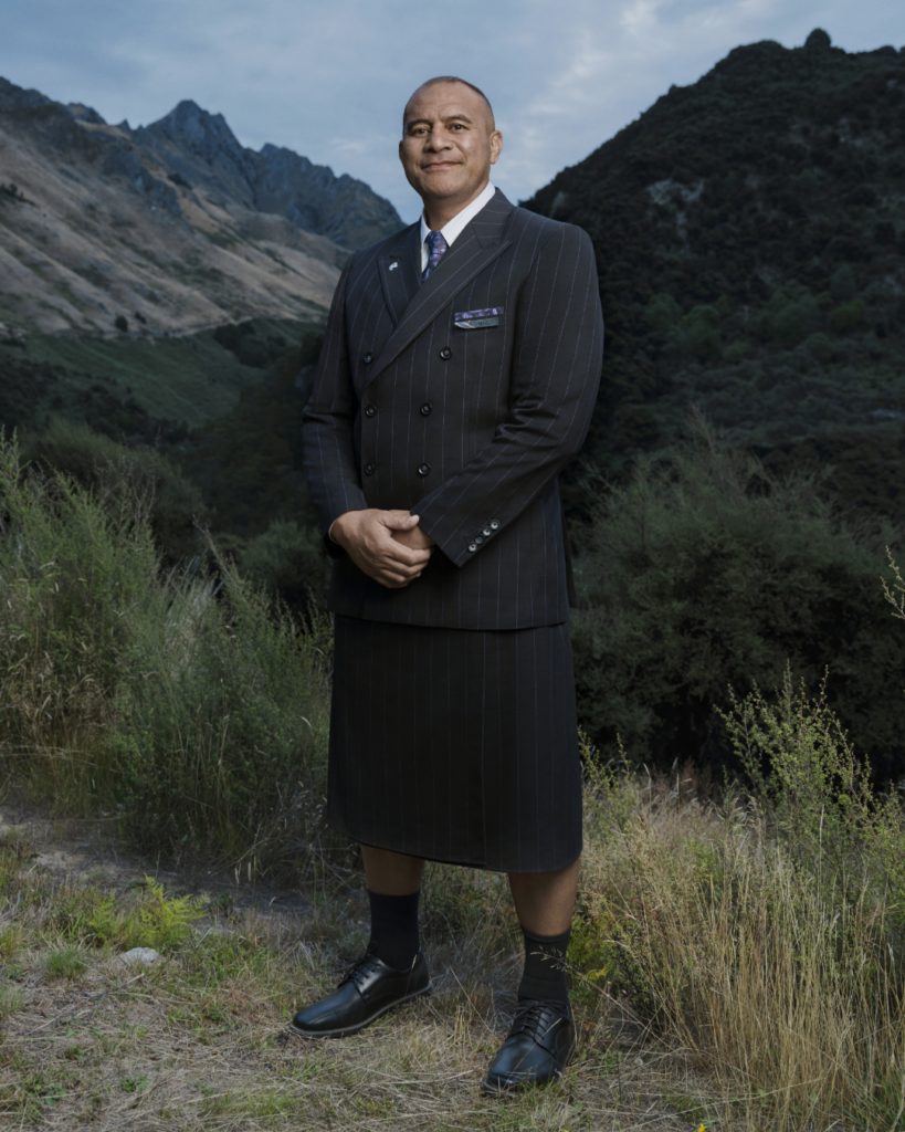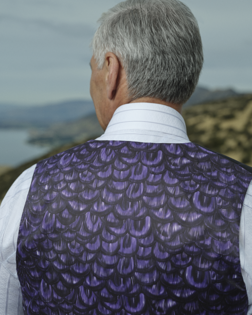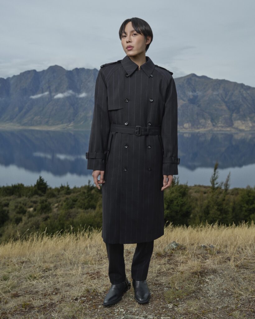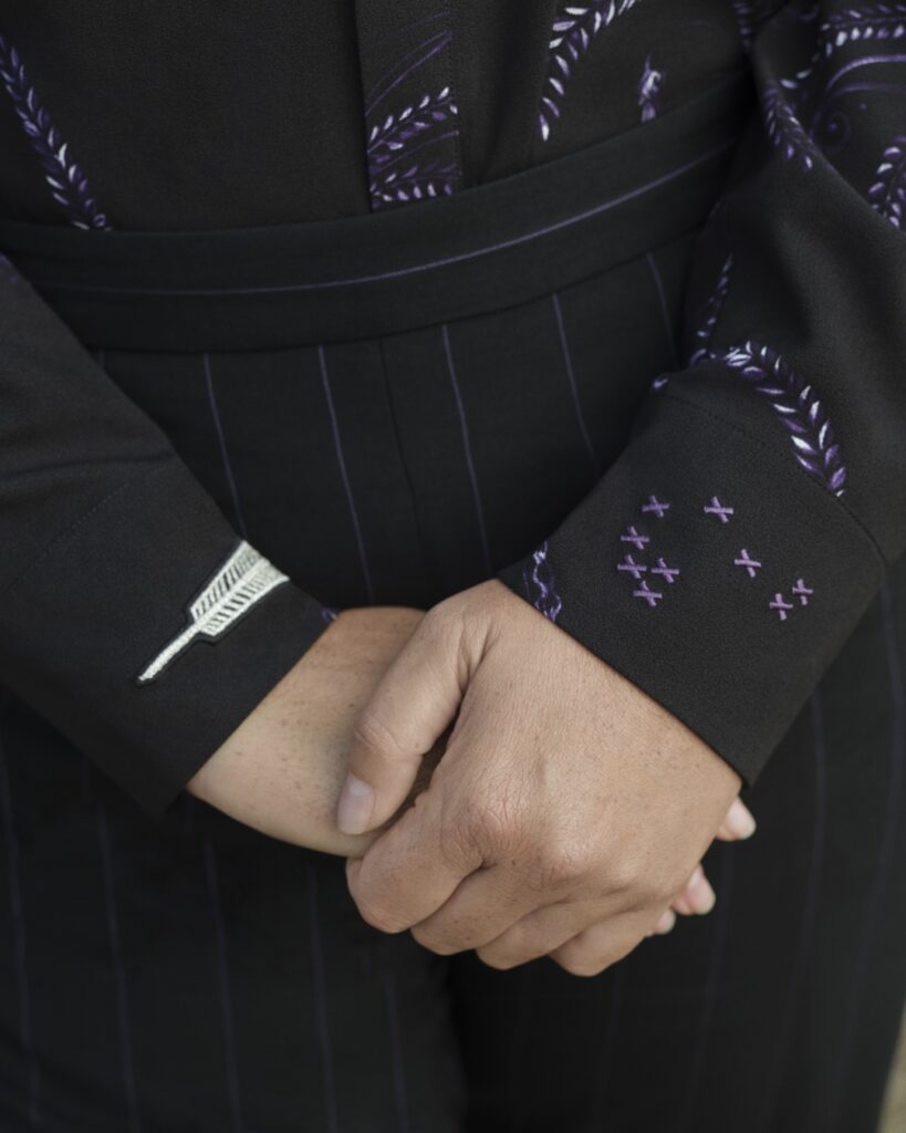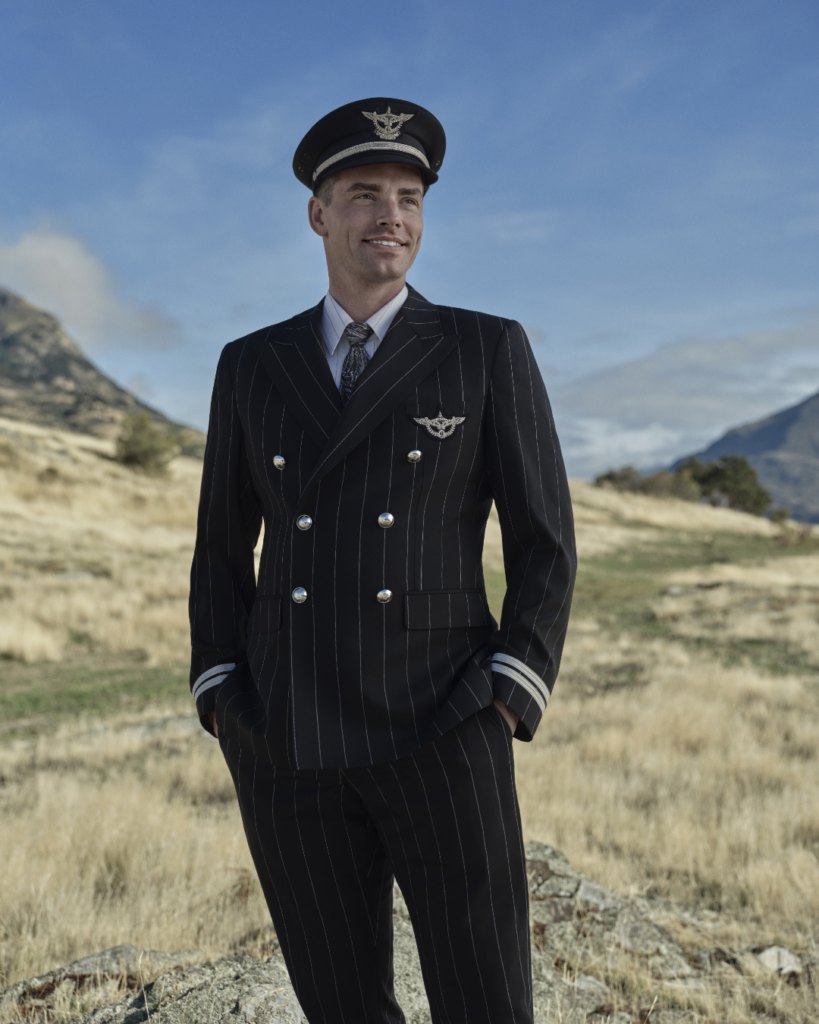 The sophisticated double breasted suit features pinstripe detailing, with the subtle inclusion of a kiwi feather print lining – an intentional nod to leadership and prestige within the Air New Zealand whānau.