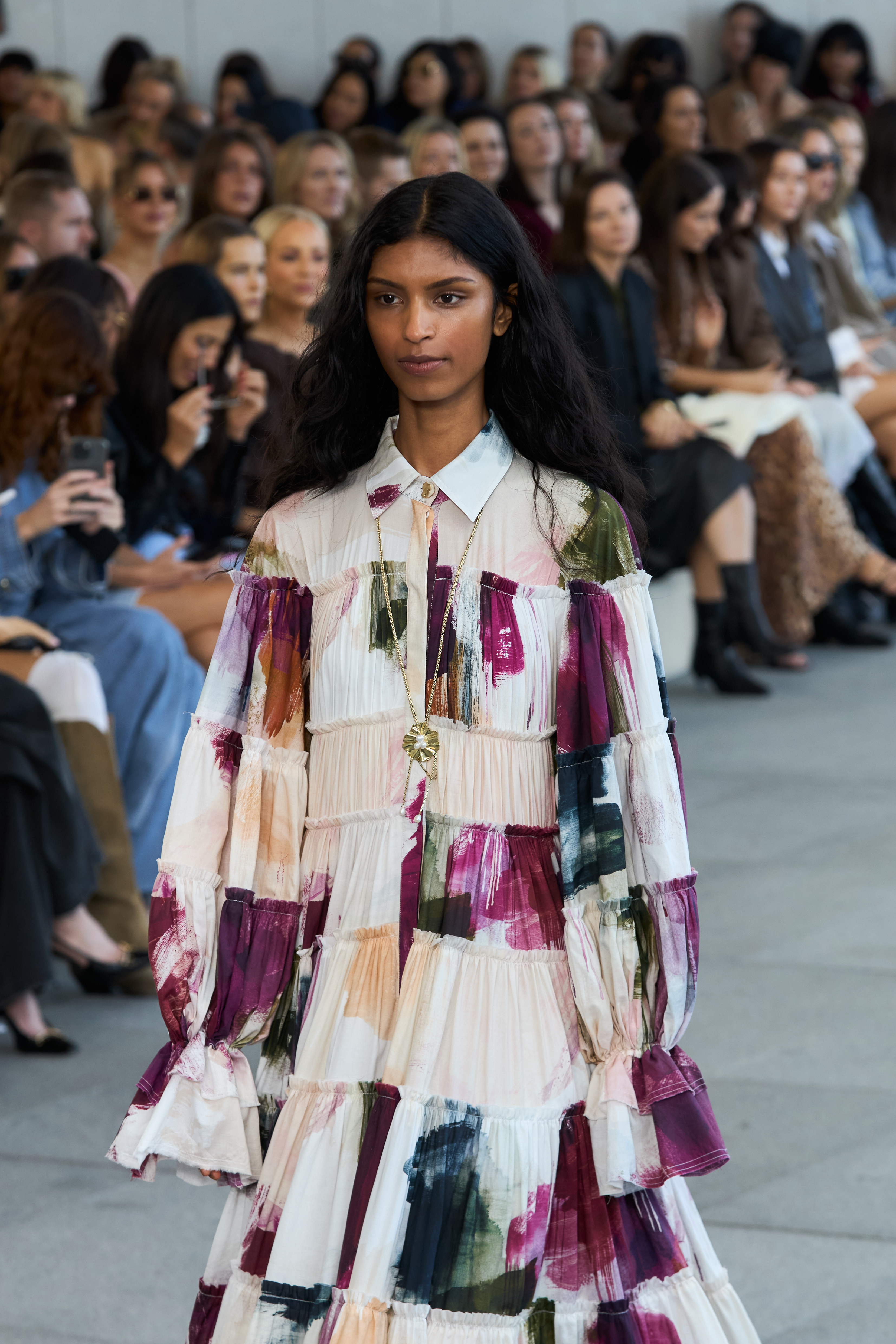 Like many shows this week, the accessories stood out — beaded belts cinched the waists, and crystals around the neck gave a nod to ‘70s boho style. The palette moved between soft mints, rich purples, mossy greens and warm browns — grounding the collection in nature. Keeping in line with the look and feel of the collection, makeup and hair were soft and natural which added to the ethereal experience of the show.