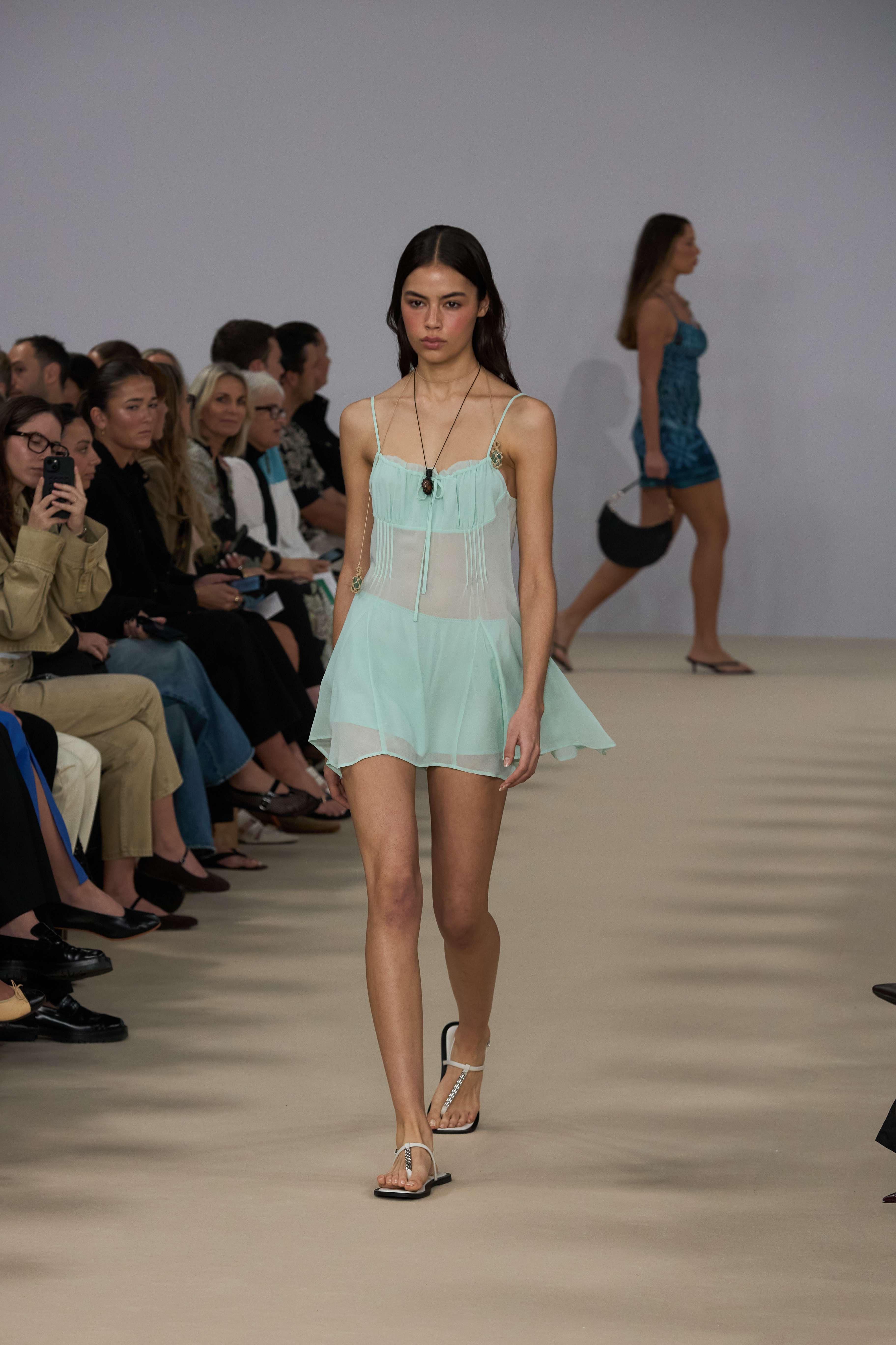 At the Hansen & Gretel show, the lights at Carriageworks dropped to total darkness before slowly returning — revealing the first look: a mint green maxi skirt with fluid lace panelling, a matching tank, and crystals strung delicately around the model’s neck. It was an ethereal opening — and a fitting preview of what was to follow.