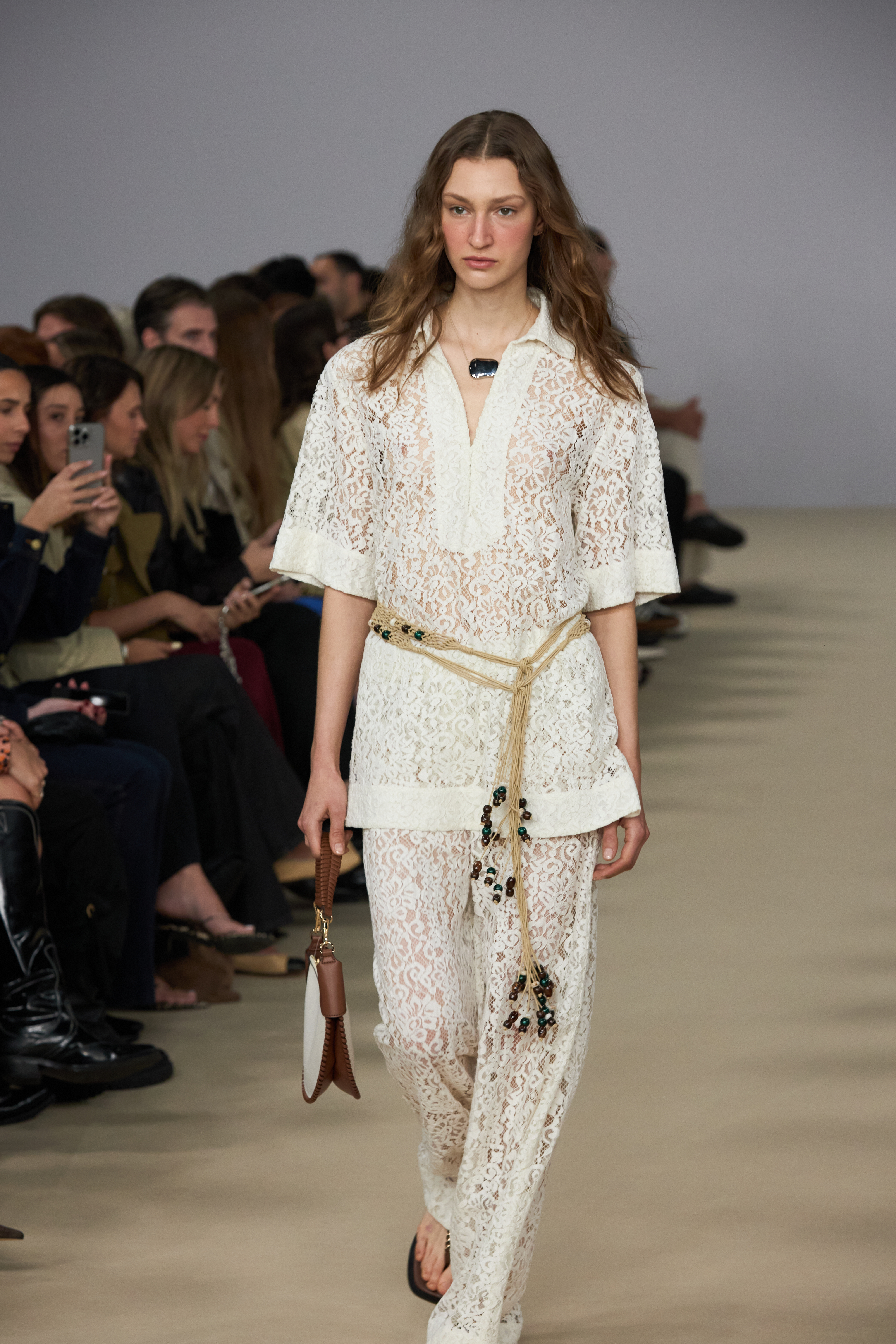 The collection embraced a free-spirited elegance, rooted in earthy tones and tactile detail. Distinctly bohemian in tone, the show featured asymmetrical hemlines, paisley and hibiscus prints, and a series of flowing silhouettes that felt effortlessly luxe. Think kaftan-style dresses, soft volume, and sheer layering.