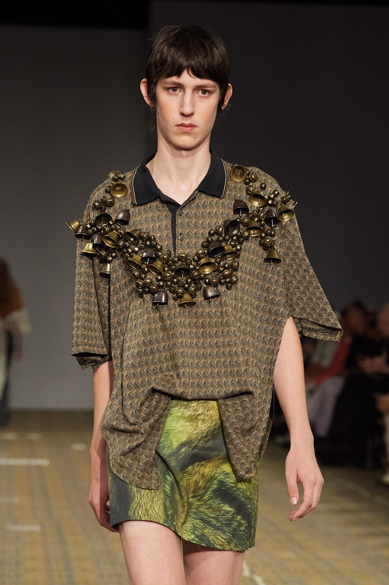Deconstructed tees and polo shirts were worn backwards, left unpicked at the seams, or layered in unexpected combinations. Printed words like ‘God’, ‘Fairytale Paradise’ and ‘Holy Fool’ appeared on shirts, reinforcing the collection’s poetic tone.