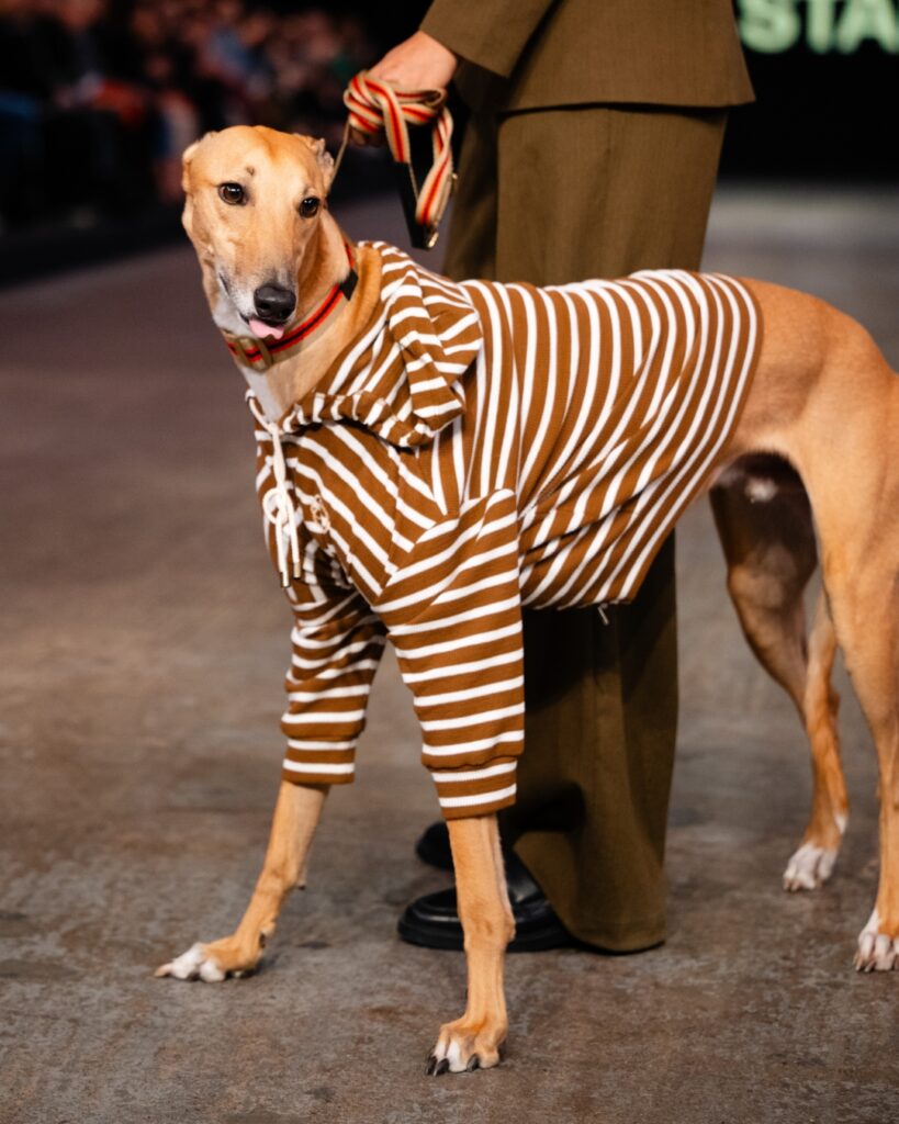 Designers including Karen Walker, Kowtow, Nom*d, Kate Sylvester, and Stolen Girlfriends Club brought their signature flair to the dogs’ wardrobes. On the runway, each piece found its own perfect canine wearer. One hound strutted in Karen Walker’s signature quilted monogram jacket, while another sported a delicate bow designed by Caitlin Snell – our personal favourite? A Stolen Girlfriends Club necklace perched delicately on a greyhound’s neck – playful, and perfectly suited to its wearer.