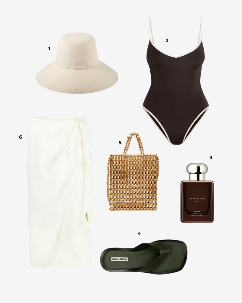 1. Lack of Colour Holiday Bucket Hat, $113. 2. Monday Swimwear Ravello One Piece, $229. 3. Jo Malone Myrrh & Tonka $266. 4. Zulu & Zephyr Thong, $319. 5. La Tribe ‘Gia’ Beaded Tote, $170. 6. Zulu & Zephyr Signature ‘Ramie’ Sarong, $137.