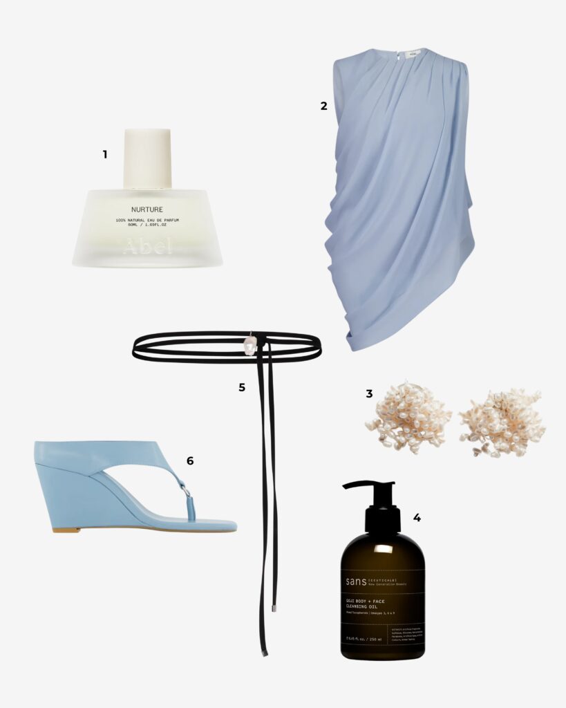1. Abel Fragrance Nurture, $330. 2. REBE Draped Top, $349. 3. Jasmin Sparrow ‘Mermaid’ Earrings, $950. 4. Sans Ceuticals Cleansing Oil, $52. 5. Harris Tapper Pearl Belt, $189. 6. REBE ‘Yvie’ Wedge Heel, $649.