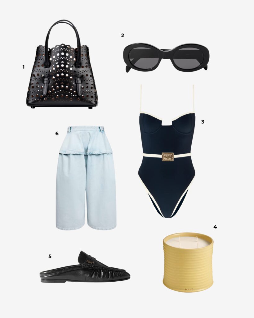 1. Alaïa Mina 16 Tote Bag, $2,823. 2. Celine Triomphe Sunglasses, $814. 3. Same Belted One Piece, $645. 4. Loewe Honeysuckle Candle, $260. 5. Saint Laurent ‘Le Loafer’ Logo-Embellished Mules, $2,199. 6. Alaïa Peplum Bermudas.