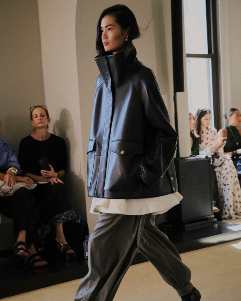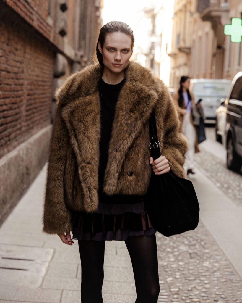 Milan Fashion Week has confirmed one thing: faux fur is back, and the leather funnel-neck jacket is also along for the ride. These statement layers are the easiest way to transform a simple outfit into something far more luxurious. Throw one over classic denim and a black boat-neck top for an effortless night-out look.