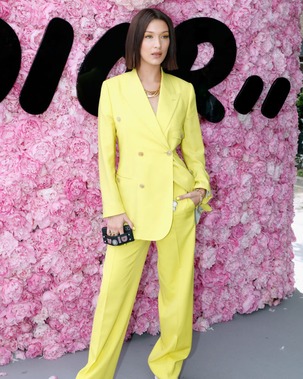 That image of Amal wearing Stella McCartney with George Clooney beaming on her arm is the standard bearer for the new trend. It appeared on the runways of Rodarte, Kenzo and Calvin Klein as well as playing a key role in spring’s street style scene. Yet, it was when Bella Hadid pitched up at Virgil Abloh’s first Louis Vuitton men’s catwalk show in a zingy neon suit with matching nails it was impossible to ignore the full-whack of this powerful shade.