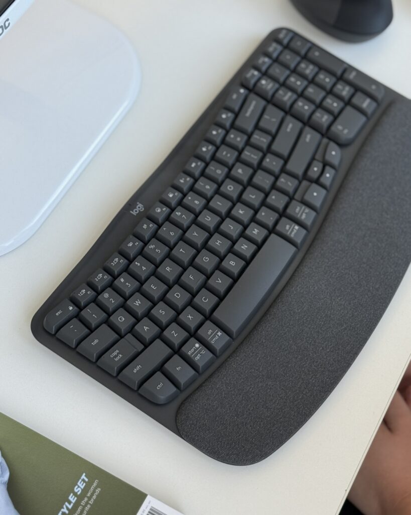 What first caught my attention was how thoughtfully designed these tools are. The Wave Keys keyboard, with its subtly wave-like shape and soft-touch keys, feels incredibly considered. Unlike the flat, rigid keyboard on my laptop, this one guides my hands into a more natural position, complete with a built-in palm rest that makes long writing sessions far more bearable. As a fashion girl with a keen eye for aesthetics (I consider minimalist stationery and the Paris Georgia ‘Career Girl’ t-shirt the height of office fashion), I was also pleasantly surprised by how seamlessly it fit into my desk set-up.