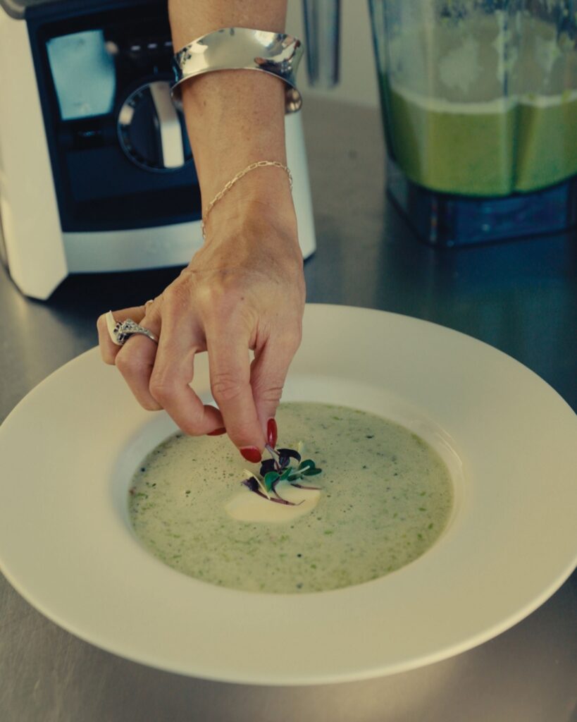 In a saucepan, melt the butter and add the shallot and garlic. Simmer on medium until soft. Add the vegetable stock and simmer for a further 5 minutes. Turn off the heat and fold through the peas and mint leaves. Give it a good stir and let it sit for a couple of minutes to cool. The peas should be defrosted by this point. Pour everything into the Vitamix, adding in the cream. Blend until smooth. Pour the soup into the serving bowls. Add a spoonful of crème fraîche to each bowl and garnish with pea shoots and mint leaves.