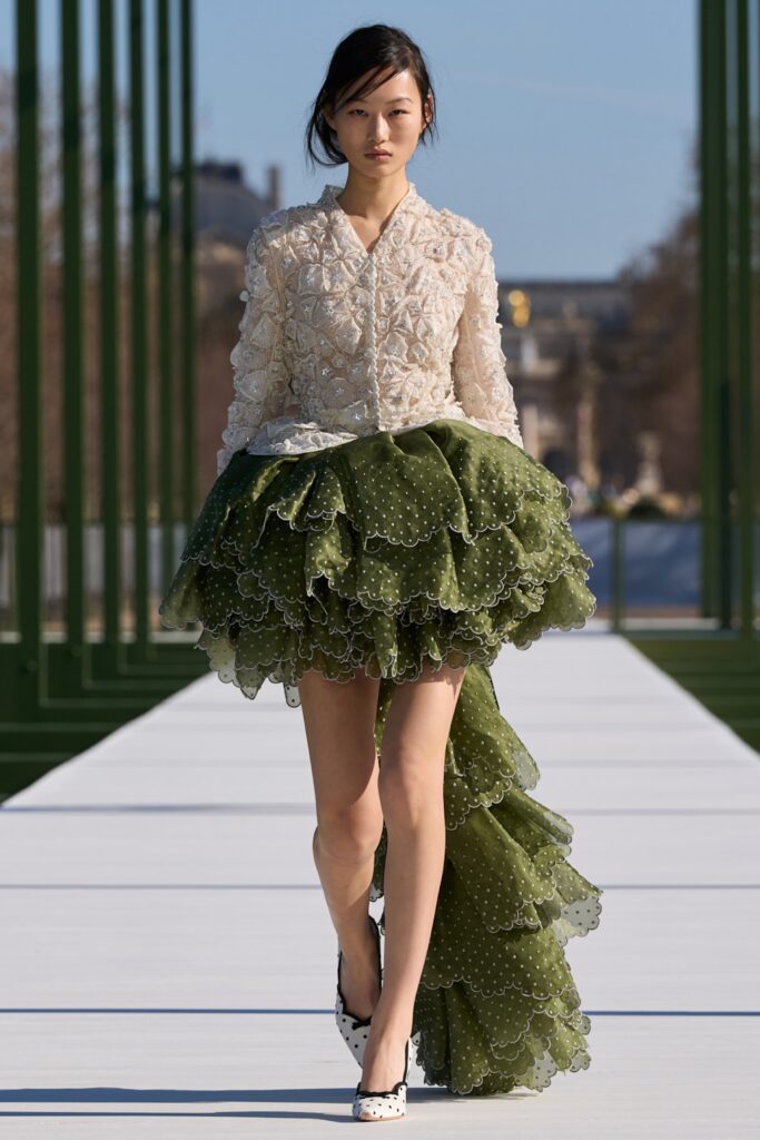 “Jonathan Anderson’s Dior show was pure magic. In the sunlit Tuileries Garden, models crossed a pond and circled a glasshouse. Anderson riffed on Dior’s love of flowers, placing floating water lilies in the pond (fake, of course, but stunning). They inspired raffia blooms on an asymmetrical lace dress, water-lily thong sandals, and more. Bar jackets softened over layered tutus, pleated silks replaced structured menswear, and coats wrapped like dressing gowns. This collection proved just how far Anderson has come in trusting his instincts – chef’s kiss!” – Sarah Murray, editor in chief