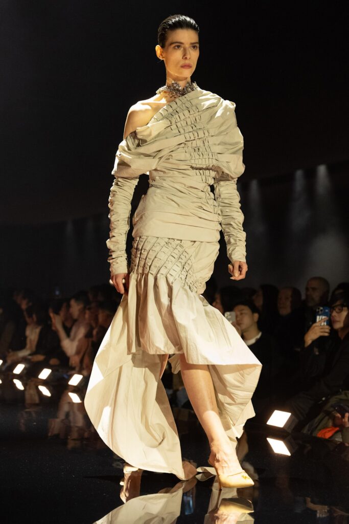 “Daniel Roseberry proved once again that few designers understand drama quite like he does. The show took place in the Carrousel du Louvre, once home to the Paris catwalks of the 1990s and early 2000s, which already feels iconic. Everywhere you looked there was something slightly offbeat. Skirts trailed into tails, fur prints appeared alongside painted crocodile scales, and one look was even crafted from unspooled cassette tapes and crushed CDs. Schiaparelli will always have my heart.” – Sophie de Renzy, multimedia content coordinator