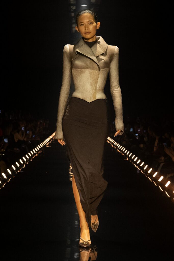 “Alongside the statement TF elegantly structured tailoring, I loved the sheer PVC bonnets and coats, which gave subtle American Psycho meets The Matrix vibes in a chic way. The aesthetic was moody and seductive, with an androgynous elegance throughout. The mixed-media fabrics (the denim too!!) and contrast collars added depth, while bold animal-print coats brought a statement moment yet it all still felt clean and minimal. I also loved the bomber jackets, which added a cool, effortless edge to the collection. In addition, spotlighting models of all different ages was refreshing to see.” – Tiffany Low, commercial director